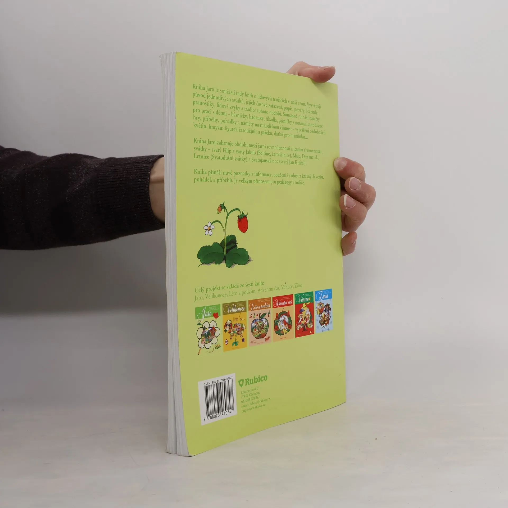 Kniha Jaro je součástí řady knih o lidových tradicích v naší zemi. Vysvětluje původ jednotlivých svátků, jejich časové zařazení, popis, pověry, legendy, pranostiky, lidové zvyky a tradice tohoto období. Současně přináší náměty pro práci s dětmi – básničky, hádanky, říkadla, písničky s notami, starodávné hry, příběhy, pohádky a náměty na rukodělnou činnost – vytváření ozdobných květin, hmyzu; figurek čarodějnic a ptáčků; dárků pro maminku… Kniha Jaro zahrnuje období mezi jarní rovnodenností a letním slunovratem, svátky – svatý Filip a svatý Jakub (Beltine, čarodějnice), Máje, Den matek, Letnice (Svatodušní svátky) a Svatojánská noc (svatý Jan Křtitel). Kniha přináší nové poznatky a informace, poučení i radost z krásných veršů, pohádek a příběhů. Je velkým přínosem pro pedagogy i rodiče.