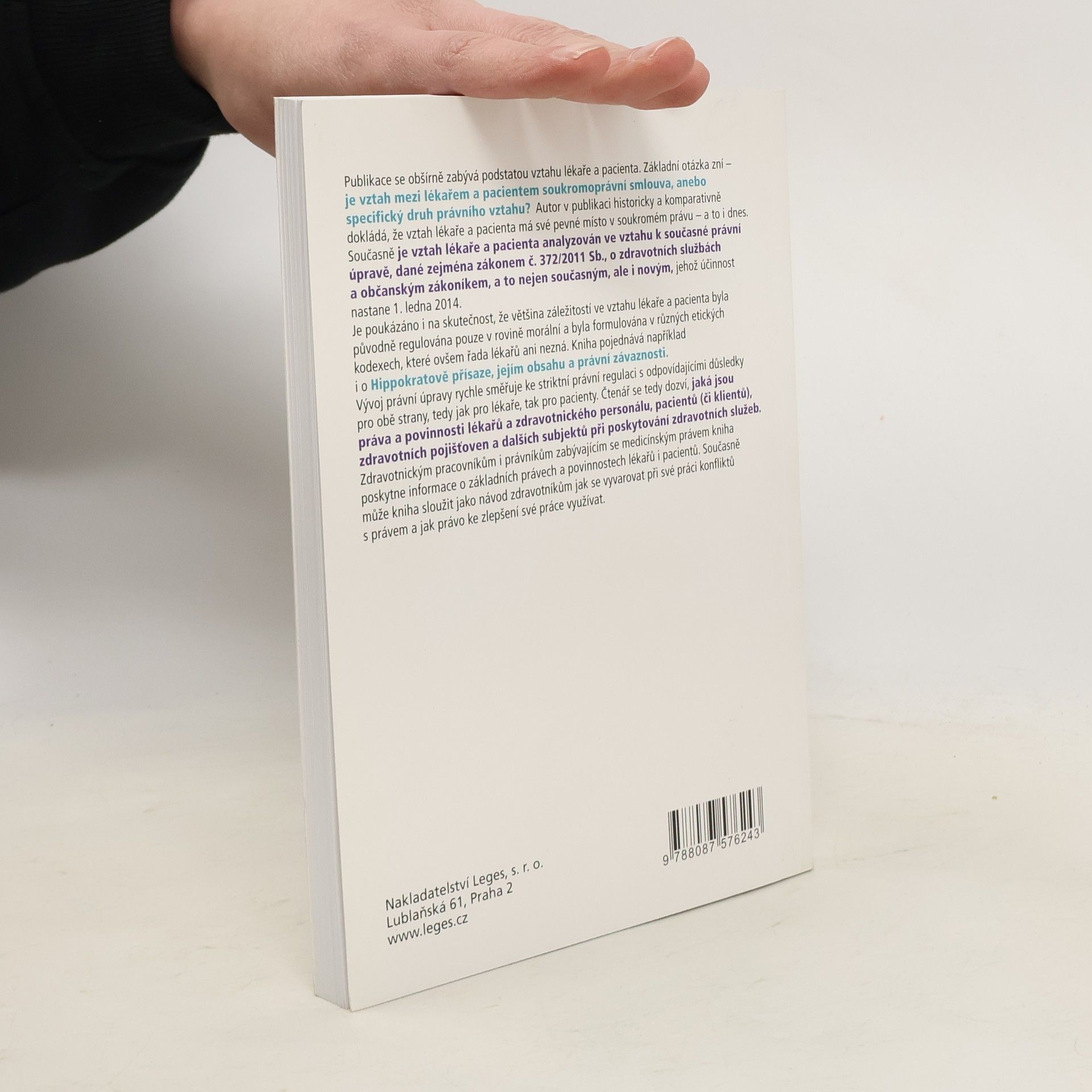 Publikace se zabývá podstatou vztahu lékaře a pacienta, přičemž klade otázku, zda jde o soukromoprávní smlouvu, nebo specifický právní vztah. Autor historicky a komparativně dokládá, že tento vztah má pevné místo v soukromém právu i dnes. Analyzuje jej v kontextu současné právní úpravy, zejména zákona č. 372/2011 Sb., o zdravotních službách, a nového občanského zákoníku, který vstoupí v účinnost 1. ledna 2014. Dále se zmiňuje, že většina aspektů vztahu byla původně regulována morálně a formulována v etických kodexech, které mnozí lékaři neznají. Kniha se dotýká například Hippokratovy přísahy, jejího obsahu a právní závaznosti. Vývoj právní úpravy směřuje ke striktní regulaci, což má důsledky pro lékaře i pacienty. Čtenář se dozví o právech a povinnostech lékařů, zdravotnického personálu, pacientů, zdravotních pojišťoven a dalších subjektů při poskytování zdravotních služeb. Zdravotnickým pracovníkům a právníkům zabývajícím se medicínským právem poskytne informace o základních právech a povinnostech, a může sloužit jako návod, jak se vyvarovat právním konfliktům a jak právo využívat ke zlepšení své práce.