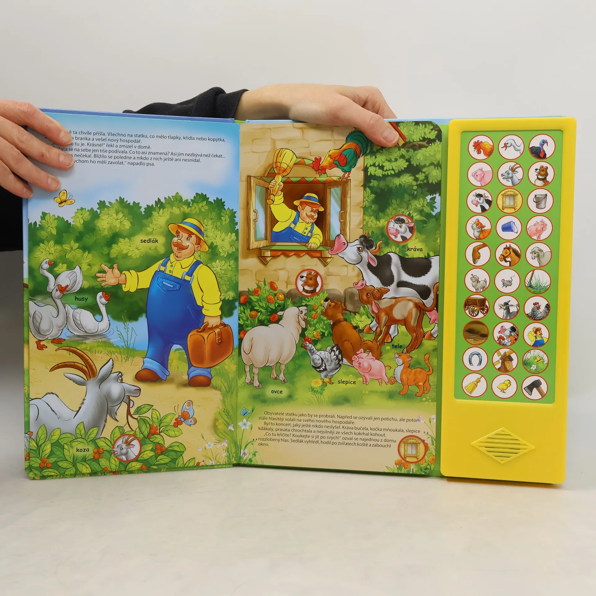Na tomto statku je všechno naopak! Právě přijel nový sedlák. Ale ouha! Sedlák je líný a zvířátka ho musí naučit, jak se má o všechno na statku postarat. Pohádku v této knížce doprovázejí zvuky, které dětem přiblíží hlasy domácích zvířátek a mnoha věcí, které v ní uvidí nakreslené. Je to jednoduché - až najdou obrázek v kroužku, zmáčknou tlačítko se stejným vyobrazením. Čtení pohádky se zvuky bude pro vás i vaše děti nevšední a příjemnou zábavou!