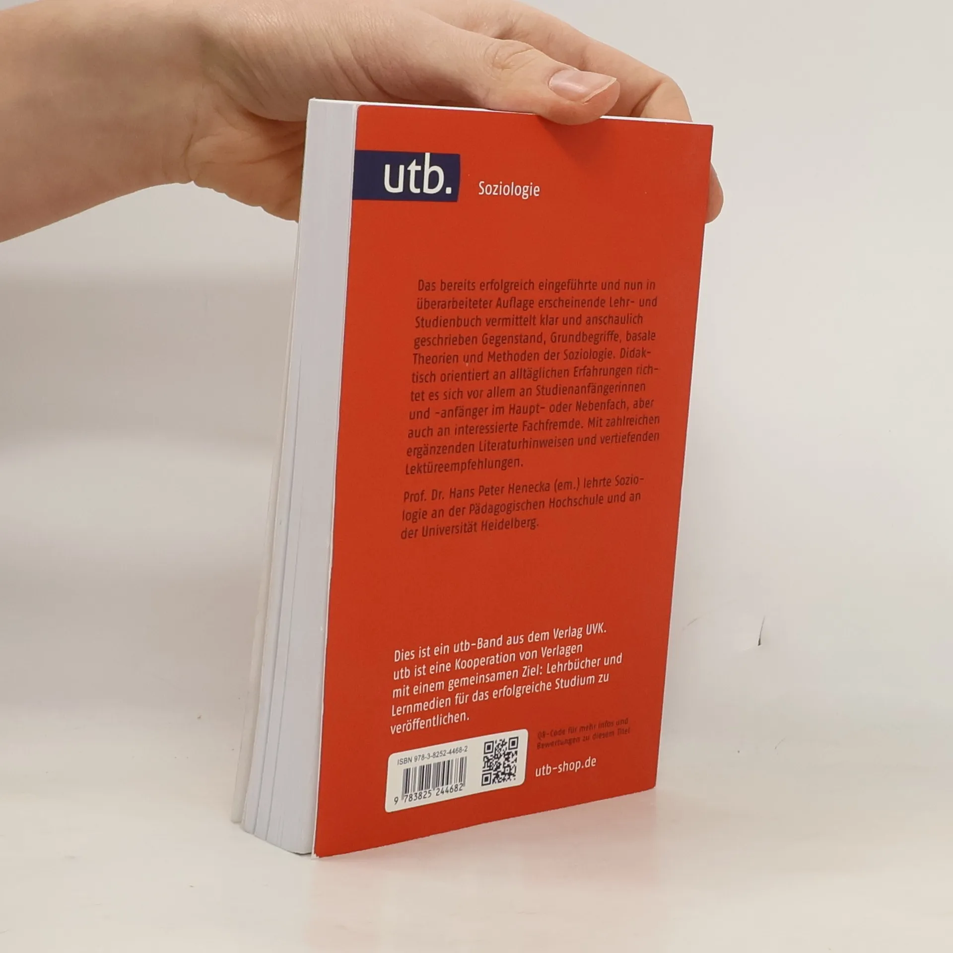 Das in überarbeiteter und aktualisierter Auflage vorliegende Lehr- und Studienbuch vermittelt klar und verständlich Gegenstand, Grundbegriffe, basale Theorien und Methoden der Soziologie. Die Einführung schafft die Grundlage für die soziologische Perspektive, mittels derer gesellschaftliche Erscheinungen betrachtet und »verstanden« werden (= Beitrag zur diagnostischen Qualifikation). Sie leistet zudem eine exemplarische Einführung in die sozialwissenschaftlichen Erkenntnis- und Untersuchungsmethoden (= Beitrag zur methodischen Qualifikation). Darüber hinaus werden pragmatische Benutzungsregeln vermittelt, die es erlauben, gesellschaftliche Phänomene in ihren vielfältigen Zusammenhängen und Verursachungen zu beobachten, zu erklären und zu beurteilen (= Beitrag zur professionellen Qualifikation). Mit zahlreichen vertiefenden Lektüreempfehlungen. Prof. Dr. Hans Peter Henecka (em.) lehrte Soziologie an der Pädagogischen Hochschule und an der Universität Heidelberg.