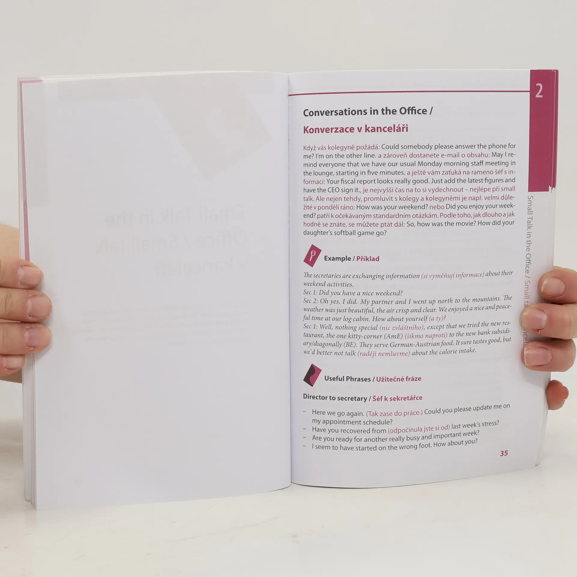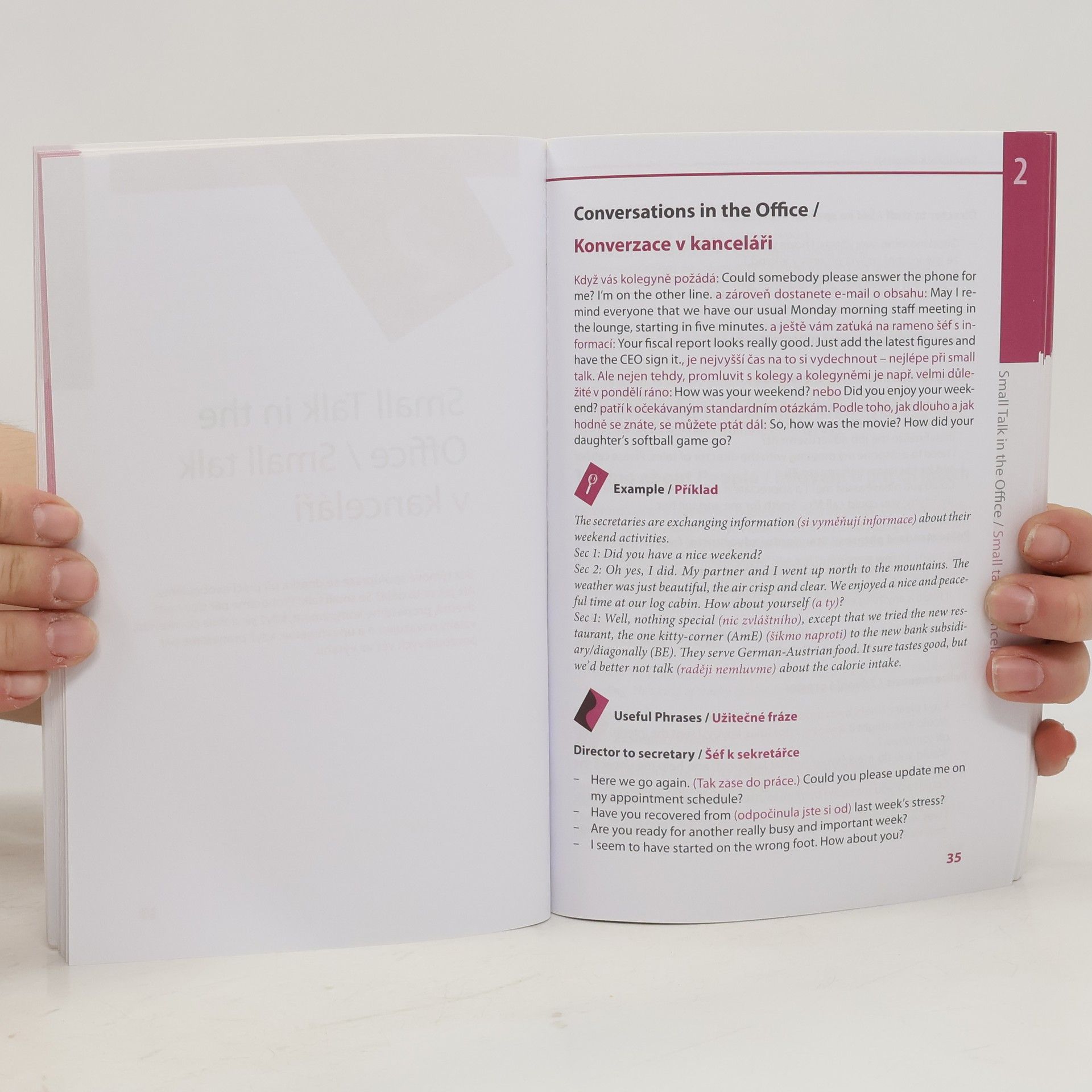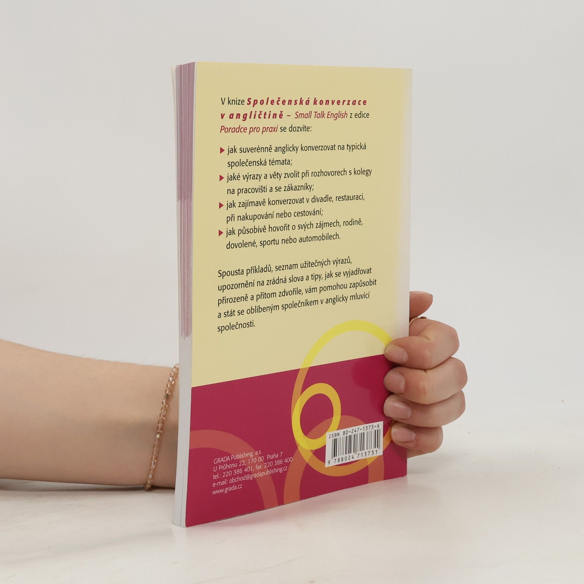 Jak suverénně anglicky konverzovat na typická společenská témata? Jaké výrazy a věty zvolit při rozhovorech s kolegy na pracovišti a se zákazníky? Jak zajímavě konverzovat v divadle, na koncertě nebo na výstavě, v restauraci, při nakupování nebo cestování? Jak působivě hovořit o svých zájmech, rodině, dovolené, sportu nebo automobilech? Spousta vzorových frází, příkladů, slovníček nejdůležitějších výrazů a tipy, jak se vyjadřovat přirozeně a přitom zdvořile, vám pomohou zapůsobit a stát se oblíbeným společníkem v anglicky mluvící společnosti. Kniha je určena především manažerům, obchodníkům, asistentkám a studentům.