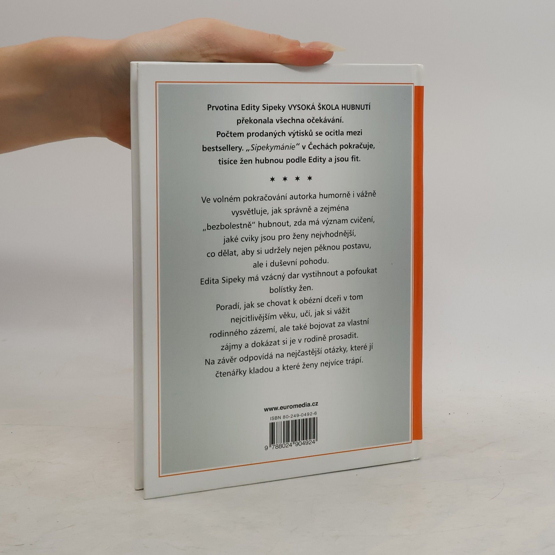 Prvotina Edity Sipeky Vysoká škola hubnutí překonala všechna očekávání. Počtem prodaných výtisků se ocitla mezi bestsellery. "Sipekymánie" v Čechách pokračuje, tisíce žen hubnou podle Edity a jsou fit. Ve volném pokračování autorka humorně i vážně podrobně vysvětluje, jak správně a zejména "bezbolestně" hubnout, zda má význam cvičení, jaké cviky jsou pro ženy nejvhodnější, co dělat, aby si udržely nejen pěknou, pružnou postavu, ale i duševní pohodu. Edita Sipeky má vzácný dar vystihnout a pofoukat bolístky žen. Poradí, jak se chovat k obézní dceři v tom nejcitlivějším věku, učí, jak si vážit rodinného zázemí, ale také bojovat za vlastní zájmy a dokázat si je v rodině prosadit. Na závěr odpovídá na nejčastější otázky, které jí čtenářky kladou a které ženy nejvíce trápí.