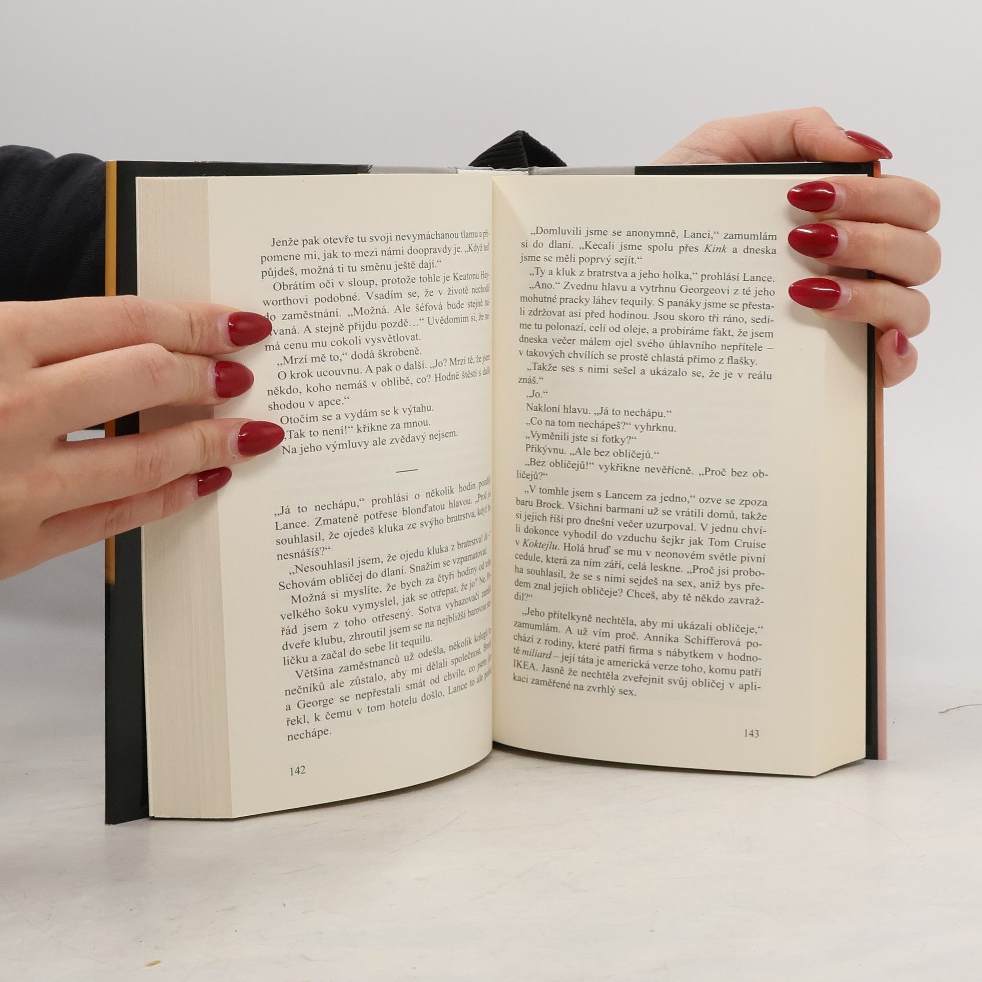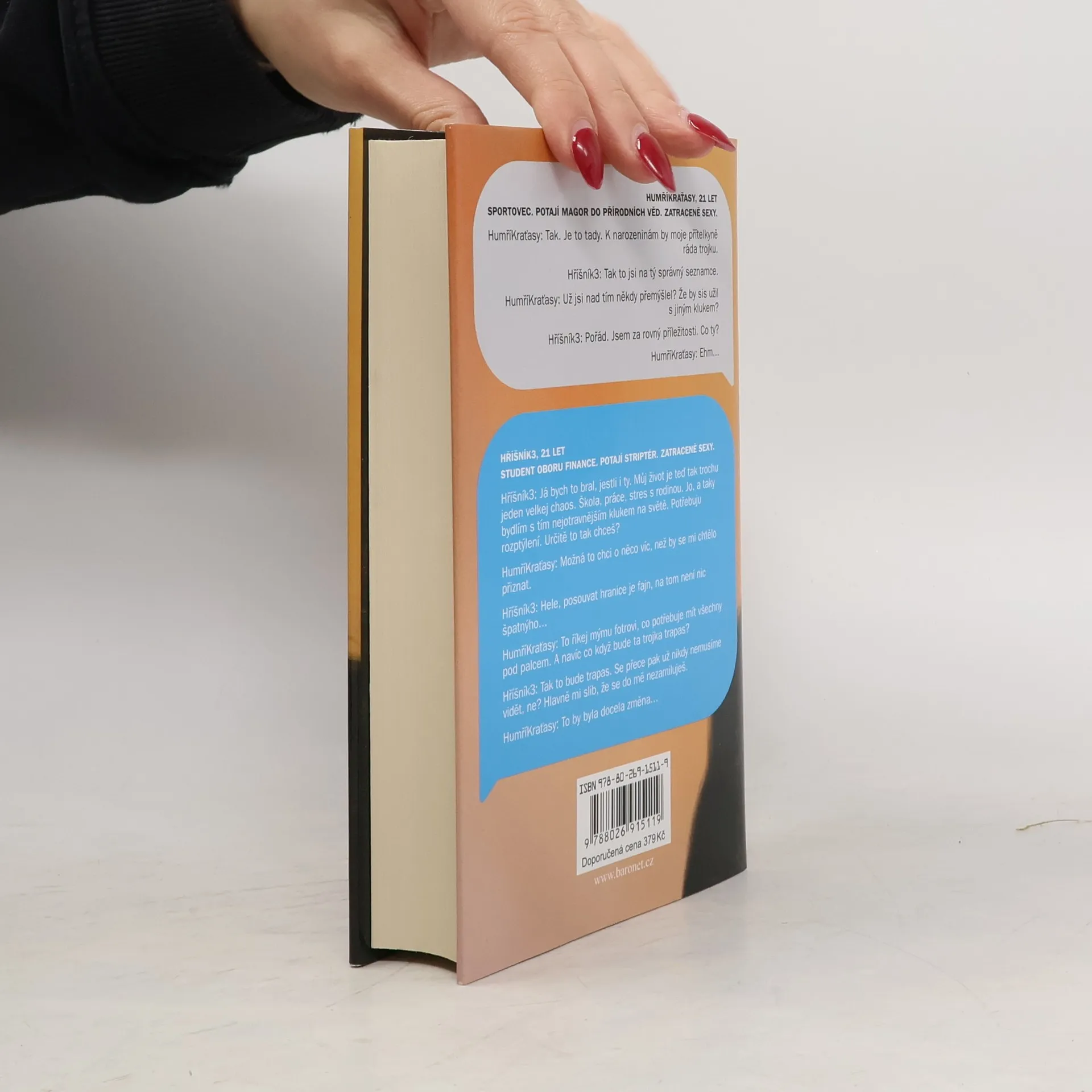 HumříKraťasy, 21 let Sportovec. Potají magor do přírodních věd. Zatraceně sexy. HumříKraťasy: Tak. Je to tady. K narozeninám by moje přítelkyně ráda trojku. Hříšník3: Tak to jsi na tý správný seznamce. HumříKraťasy: Už jsi nad tím někdy přemýšlel? Že by sis užil s jiným klukem? Hříšník3: Pořád. Jsem za rovný příležitosti. Co ty? HumříKraťasy: Ehm… Hříšník3, 21 let Student oboru finance. Potají striptér. Zatraceně sexy. Hříšník3: Já bych to bral, jestli i ty. Můj život je teď tak trochu jeden velkej chaos. Škola, práce, stres s rodinou. Jo, a taky bydlím s tím nejotravnějším klukem na světě. Potřebuju rozptýlení. Určitě to tak chceš? HumříKraťasy: Možná to chci o něco víc, než by se mi chtělo přiznat. Hříšník3: Hele, posouvat hranice je fajn, na tom není nic špatnýho… HumříKraťasy:To říkej mýmu fotrovi, co potřebuje mít všechny pod palcem. A navíc co když bude ta trojka trapas? Hříšník3: Tak to bude trapas. Se přece pak už nikdy nemusíme vidět, ne? Hlavně mi slib, že se do mě nezamiluješ. HumříKraťasy: To by byla docela změna…