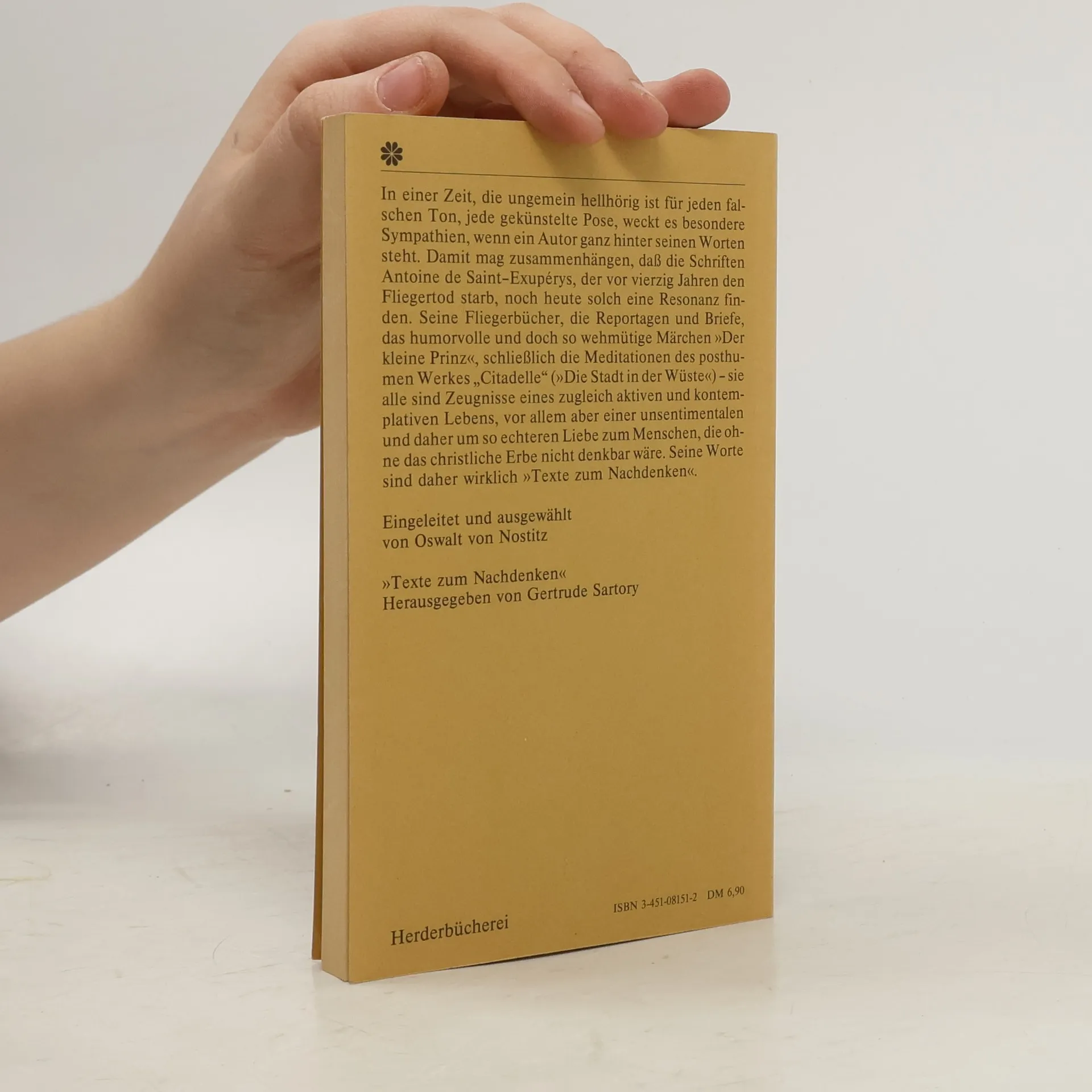 In einer Zeit, die ungemein hellhörig ist für jeden falschen Ton, jede gekünstelte Pose, weckt es besondere Sympathien, wenn ein Autor ganz hinter seinen Worten steht. Damit mag zusammenhängen, dass die Schriften Antoine de Saint-Exupéys, der vor vierzig Jahren den Fliegertod starb, noch heute solch eine Resonanz finden. Seine Fliegerbücher, die Reportagen und Briefe, das humorvolle und doch so wehmütige Märchen "Der kleine Prinz", schließlich die Meditationen des posthumen Werkes "Citadelle" ("Die Stadt in der Wüste") - sie alle sind Zeugnisse eines zugleich aktiven und kontemplativen Lebens, vor allem aber einer unsentimentalen und daher um so echteren Liebe zum Menschen, die ohne das christliche Erbe nicht denkbar wäre. Seine Worte sind daher wirklich "Texte zum Nachdenken".
