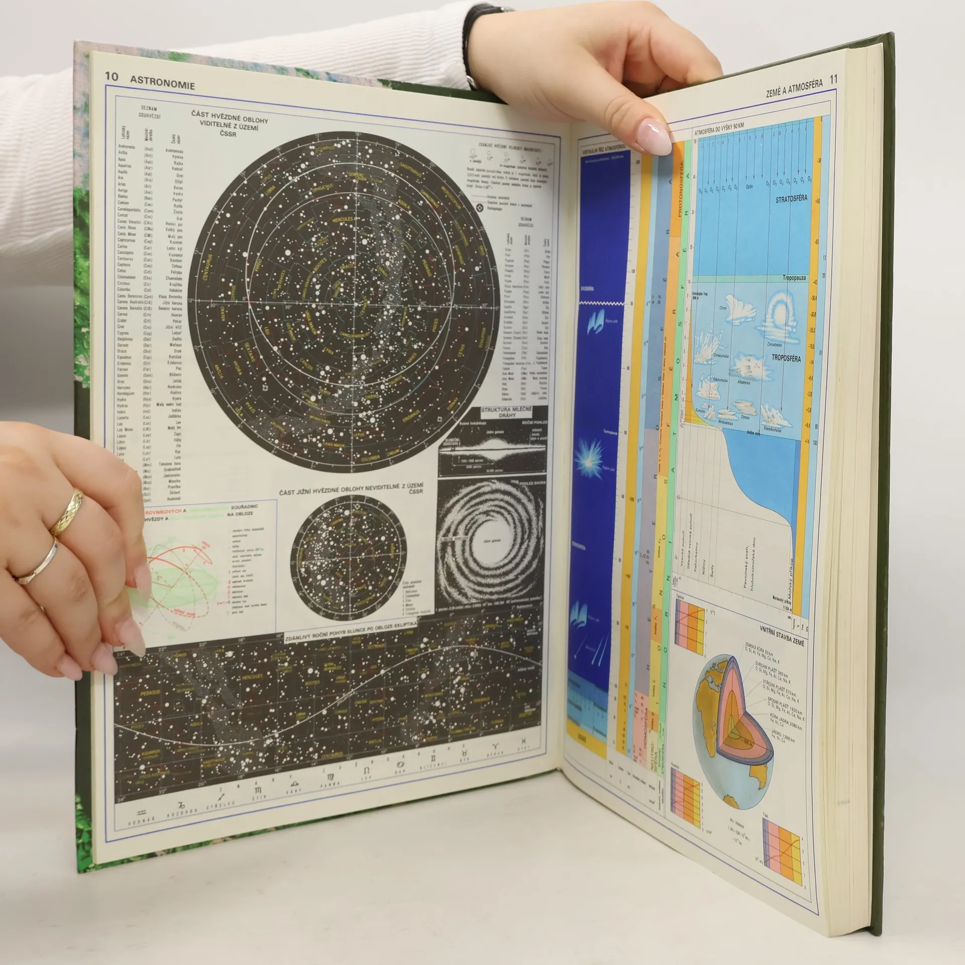 Atlas světa s mapami SSSR, Jugoslávie, NSR, NDR, ČSSR, rozdělení zemí před rozpadem Východního bloku. Také mapa Měsíce, postavení planet, astronomie, pohledy na hvězdnou oblohu obou polokoulí.