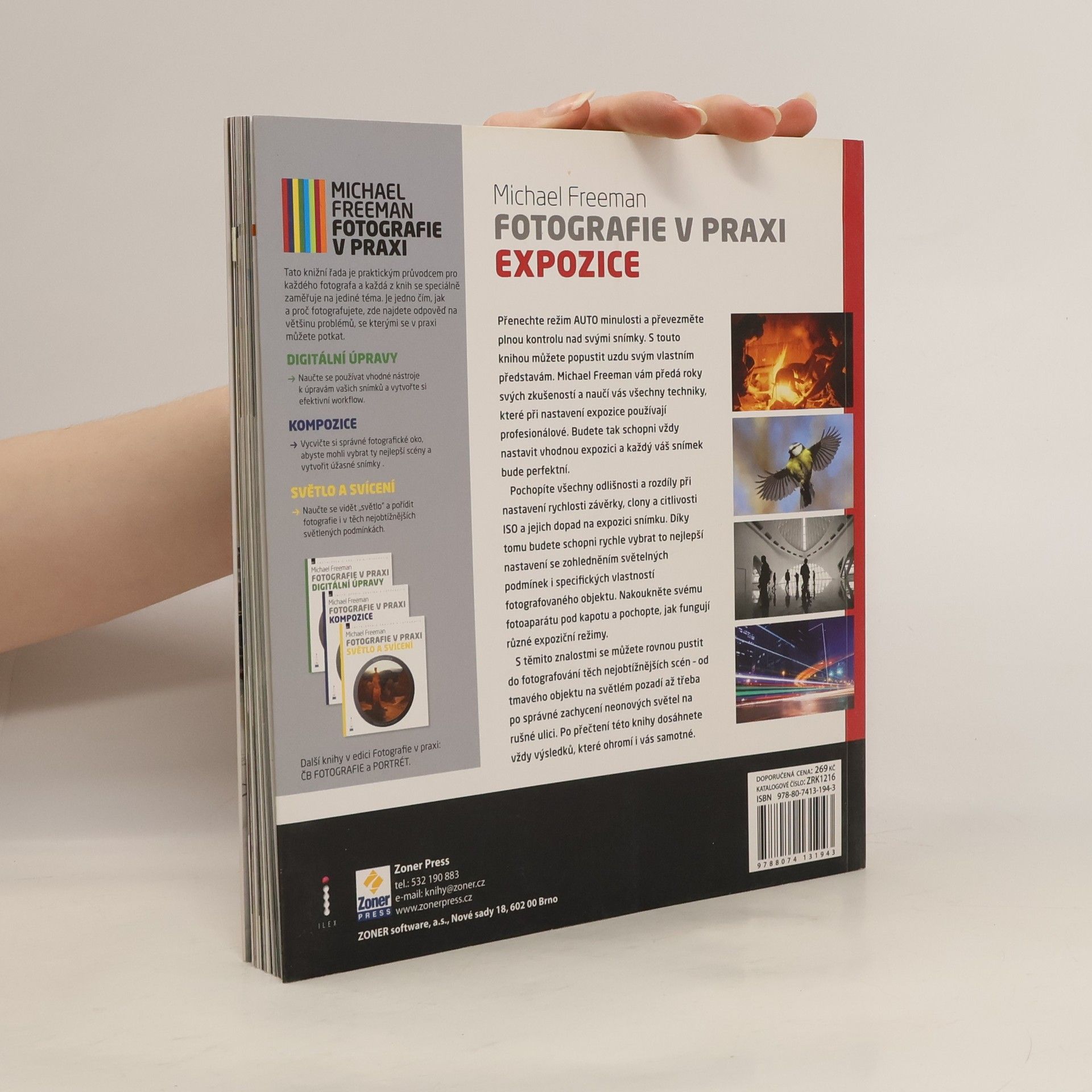 Expozice je základem každé digitální fotografie a tato kniha vám ukáže, jak na to. Ediční řada Fotografie v praxi je určena všem zájemcům o digitální fotografii (i když ji mohou využít i fotografové pracující stále s klasickými filmovými fotoaparáty). Postupně v této řadě vycházejí specializované publikace pro různé okruhy problémů, které zajímají každého fotografa. Výhodou těchto knih je skutečnost, že se v nich stále dokola neopakují informace o základech fotografování, fungování digitálního fotoaparátu a podobné věci, kterým se v jiných publikacích věnuje spousta místa. Každá z knih se zabývá pouze určitou oblastí fotografování a probírá ji důkladně v rozsahu vhodném pro začínajícího až středně pokročilého fotografa. Expozice může být technicky dobrá a špatná, může ale být i kreativní a může z obyčejného snímku udělat snímek zajímavý. Co a jak expozici určuje, jak expozici měřit a jak jednotlivé parametry, čas, clona a citlivost ISO ovlivňují vzhled výsledného snímku, to je obsahem této knihy. Opustíte režim AUTO a naučíte se optimálně měřit expozici v nejrůznějších světelných podmínkách a pracovat v režimech, které vám dovolí tvořit kreativně, a ne pouze akceptovat automatické nastavení fotoaparátu. Knihy řady Fotografie v praxi obsahují i cvičení, která by měl čtenář absolvovat, a ukázku, jak tato cvičení splnili studenti autorových kurzů. Podnětné je i autorovo hodnocení a poznámky k těmto ukázkovým fotografiím.