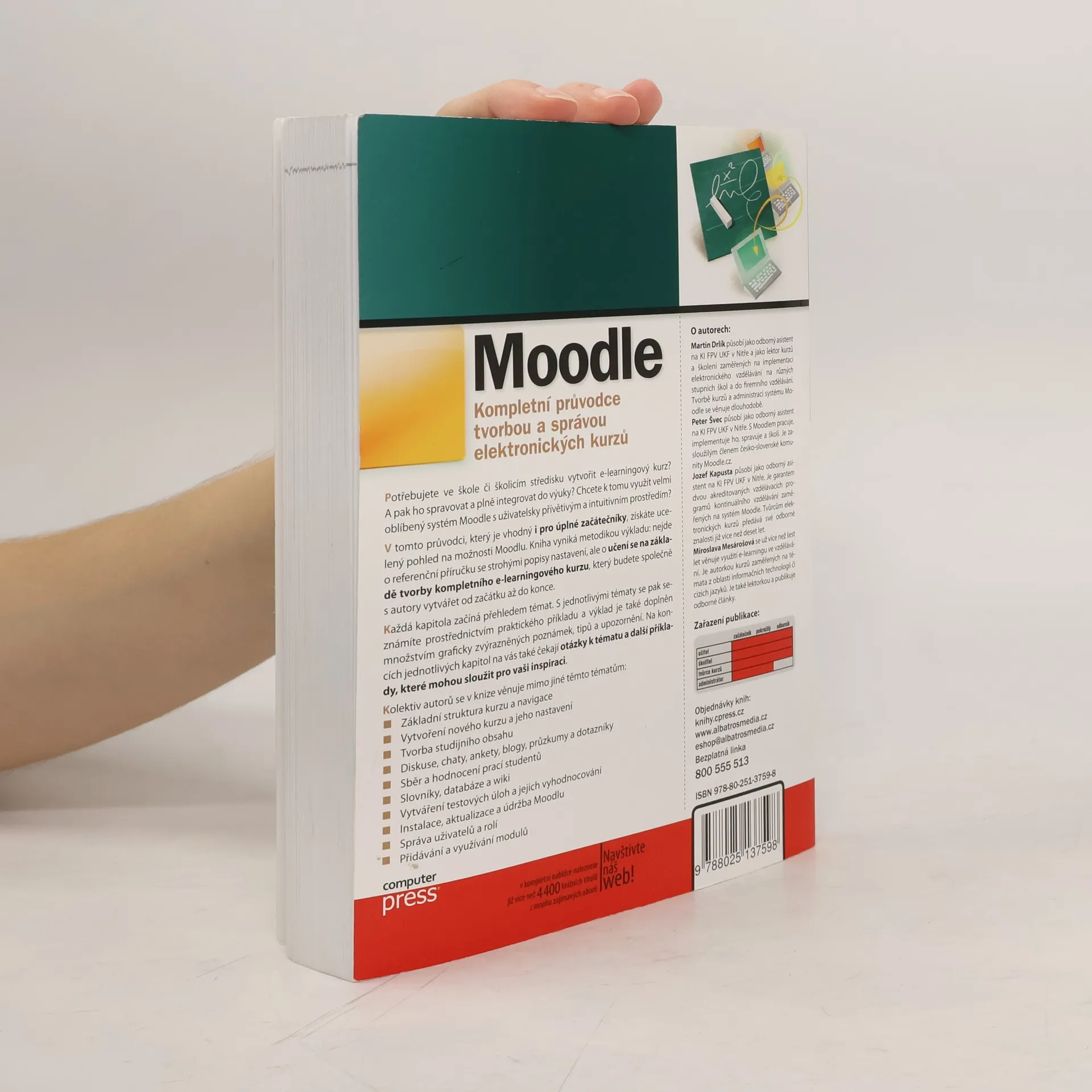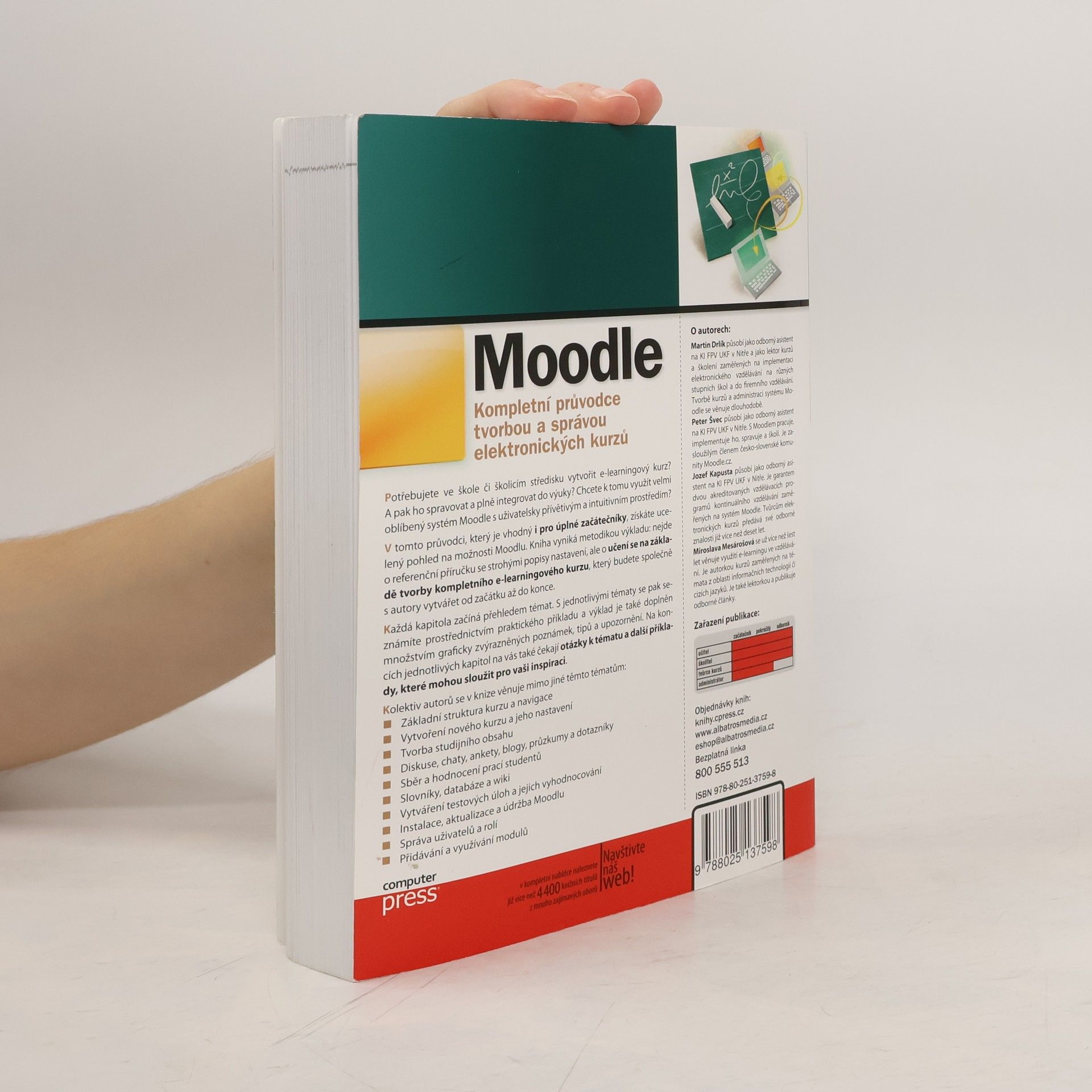 Potřebujete ve škole či školicím středisku vytvořit e-learningový kurz? A pak ho spravovat a plně integrovat do výuky? Chcete k tomu využít velmi oblíbený systém Moodle s uživatelsky přívětivým a intuitivním prostředím? V tomto průvodci, který je vhodný i pro úplné začátečníky, získáte ucelený pohled na možnosti Moodlu. Kniha vyniká svou metodikou výkladu: nejde o referenční příručku se strohými popisy nastavení, ale o učení se na základě tvorby kompletního e-learningového kurzu.