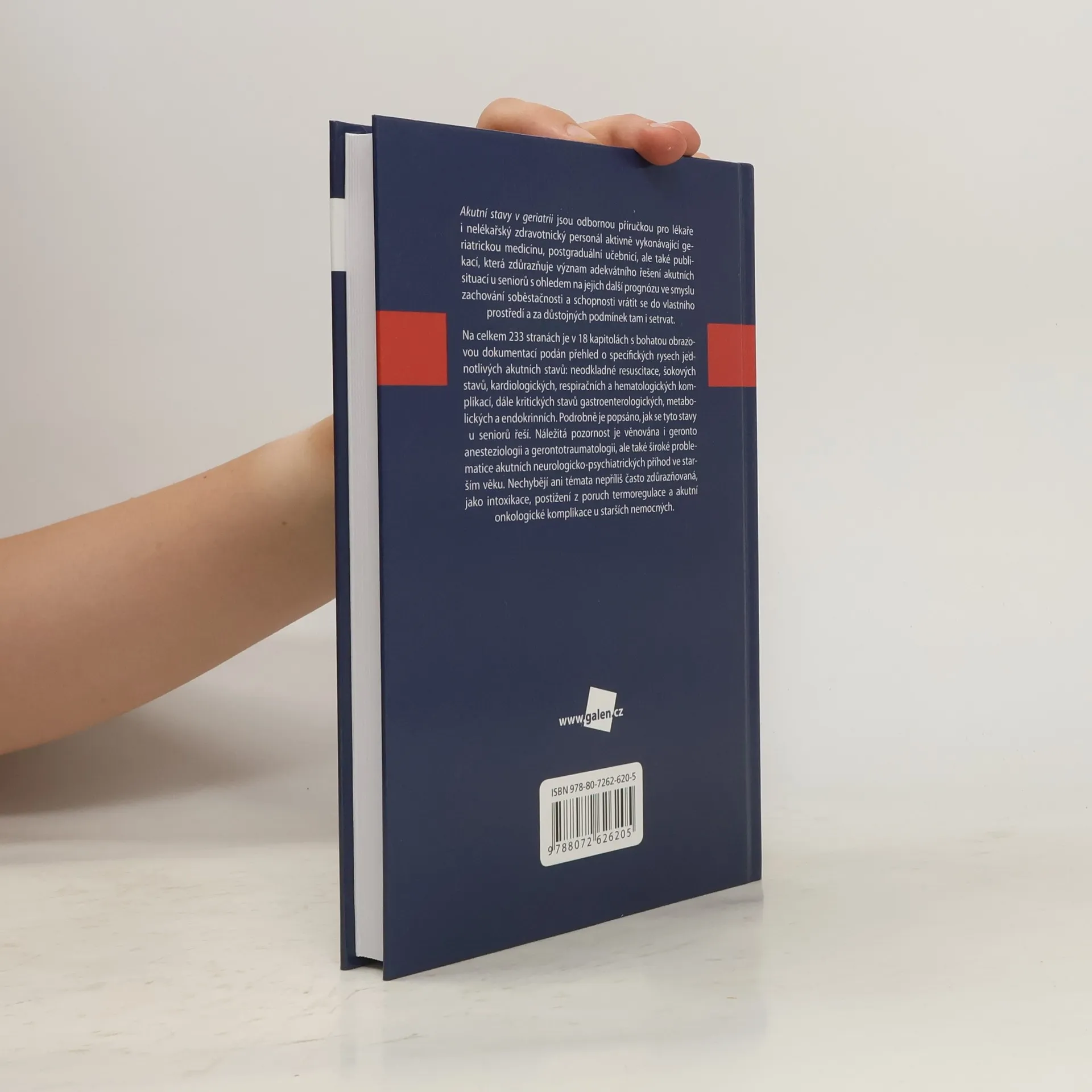 Akutní stavy v geriatrii jsou odbornou příručkou pro lékaře i nelékařský zdravotnický personál aktivně vykonávající geriatrickou medicínu, postgraduální učebnicí, ale také publikací, která zdůrazňuje význam adekvátního řešení akutních situací u seniorů s ohledem na jejich další prognózu ve smyslu zachování soběstačnosti a schopnosti vrátit se do vlastního prostředí a za důstojných podmínek tam i setrvat. Na celkem 232 stranách je v 18 kapitolách s bohatou obrazovou dokumentací podán přehled o specifických rysech jednotlivých akutních stavů: neodkladné resuscitace, šokových stavů, kardiologických, respiračních a hematologických komplikací, dále kritických stavů gastroenterologických, metabolických a endokrinních. Podrobně je popsáno, jak se tyto stavy u seniorů řeší. Náležitá pozornost je věnována i gerontoanesteziologii a gerontotraumatologii, ale také široké problematice akutních neurologicko-psychiatrických příhod ve starším věku. Nechybějí ani témata nepříliš často zdůrazňovaná, jako jsou intoxikace, postižení z poruch termoregulace a akutní onkologické komplikace u starších nemocných.