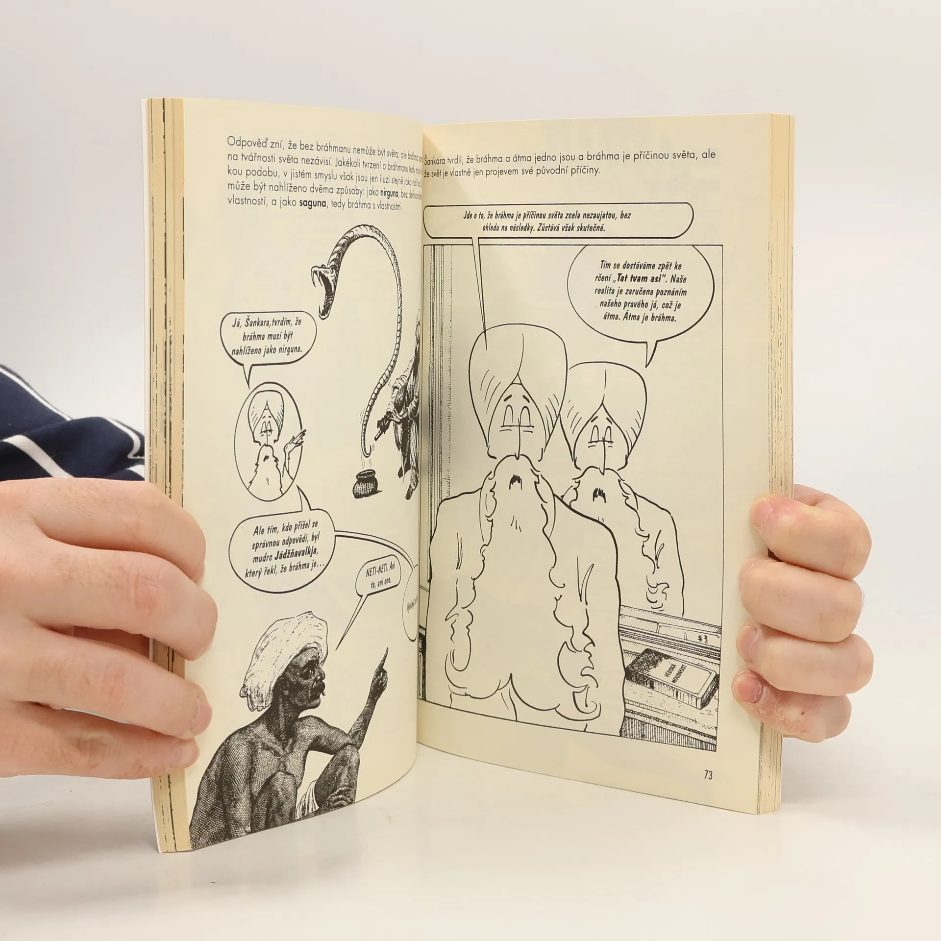Kniha předkládá zábavnou komiksovou formou přehled důležitých myšlenek a konceptů východní filozofie. Zvláště se zabývá myšlenkovými proudy, které se zrodily v Číně a Indii, mají prastaré kořeny a dnes stále víc ovlivňují myšlení a náboženské vnímání západního světa. Brilantním a zároveň humorným způsobem se zde vysvětlují základy různých škol indického hinduismu a buddhismu nebo čínská konfuciánská a taoistická. Seznámíme se tak se základy východní eschatologie, neosobní etiky, s pojmy osvícení a nirvána v kontrastu se západním pojetím individualismu a vědeckého pohledu na svět. Kniha je určena studentům filozofie a religionistiky.